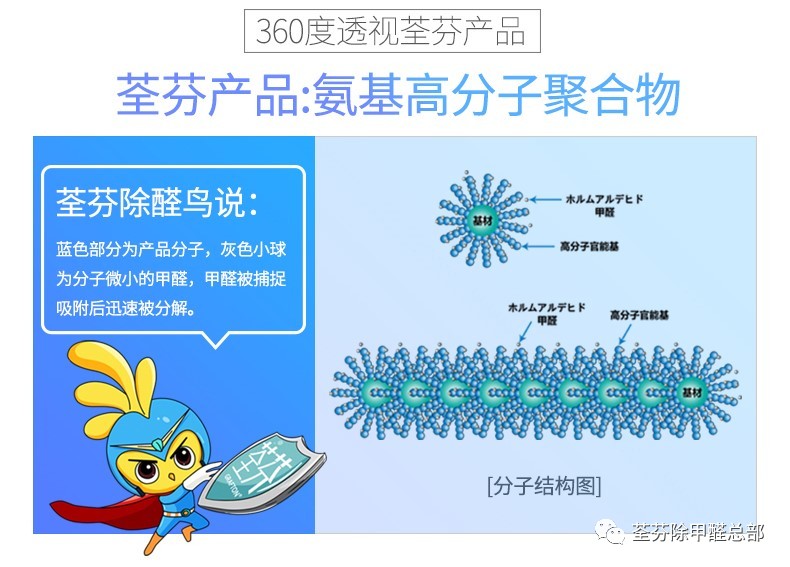 通過長效除醛劑(氨基高分子聚合物)與甲醛高效反應(yīng),生成類氨基酸物質(zhì)和氣態(tài)水,進(jìn)而將甲醛等有害污染物去除。