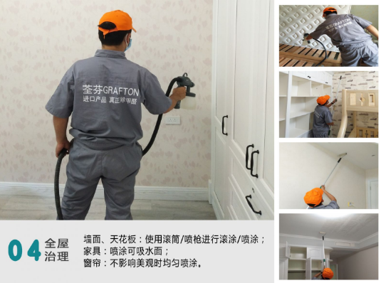 好產品還需要搭配好服務,荃芬專業凈醛服務,用目前世界上除醛性能卓越的荃芬GRAFTON甲醛清除劑(日本專利技術),通過荃芬專業化施工,保證了最大的甲醛清除速度及長達5~8年以上的效果保持。施工后快速將室內甲醛濃度降低至安全范圍,并持久保持5~8年以上。保證了普通消費者在日常生活中的室內空氣安全,解決了消費者面臨的室內甲醛污染問題。