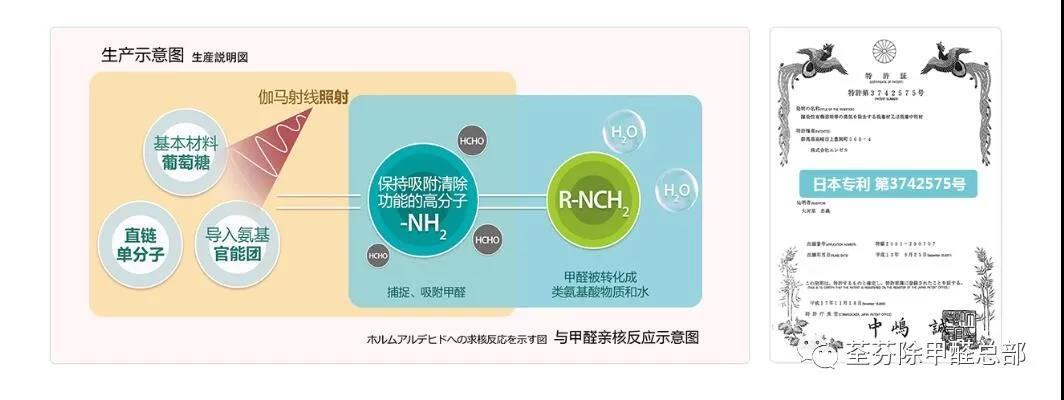 荃芬GRAFTON長效除醛劑因采用放射線照射生成的聚合高性能高分子反應技術而取得日本國專利(專利第3742575號)。