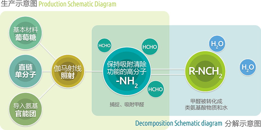 基本原料是葡萄糖等安全物質,原料經過伽馬射線照射,生成穩定的氨基高分子聚合物,捕捉、吸附空氣中的甲醛,并與其反應生成類氨基酸物質與水。整個反應過程安全高效,反應后無任何有害物質生成。